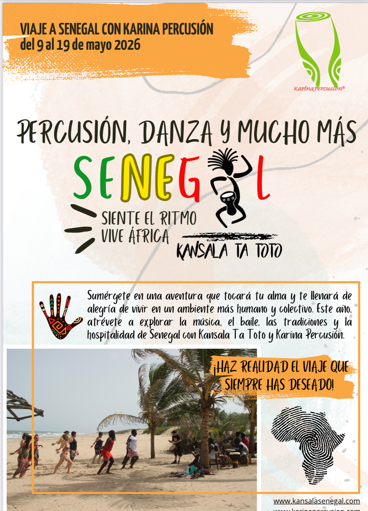Un viaje de inmersión cultural que te permitirá explorar y profundizar en el fascinante mundo de la danza y la percusión africana. Impartido por distinguidos maestros en ambas disciplinas, con un programa de excursiones, talleres y actividades de convivencia con la comunidad, está diseñado para que disfrutes de unas vacaciones únicas y llenas de sorpresas, en un entorno paradisíaco junto al mar.